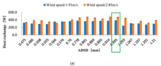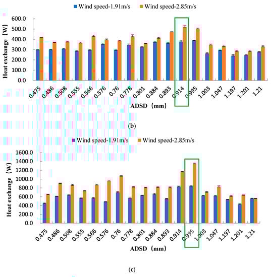 Under combination I, when the wind speeds were 1.91 m·s−1 and 2.85 m·s−1, the heat exchange reached the maximum at 0.995 mm ADSD, which was 374.1 W and 466.0 W. Under combination II, when the wind speed was 1.91 m·s−1, the heat exchange reached the maximum (378.8 W) at 0.995 mm ADSD. When the wind speed was 2.85 m·s−1, the heat exchange reached the maximum (519.9 W) at 0.914 mm ADSD. Under combination III, when the wind speeds were 1.91 m·s−1 and 2.85 m·s−1, the heat exchange reached the maximum at 0.995 mm ADSD, which was 842.7 W and 1350 W, respectively.