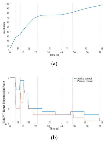 - The control strategy was tested based on the driver’s real-time test platform. The test data showed that under the same hardware conditions, the vehicle powertrain under the control of the active control strategy can effectively and quickly provide backup power compared with the passive control strategy. Compared with passive control, under the active control strategy, the motor efficiency increased by 0.61%, the EMCVT transmission ratio average rate of change reduced by 42.57%, and the overall efficiency of the vehicle powertrain system increased by 0.6%.