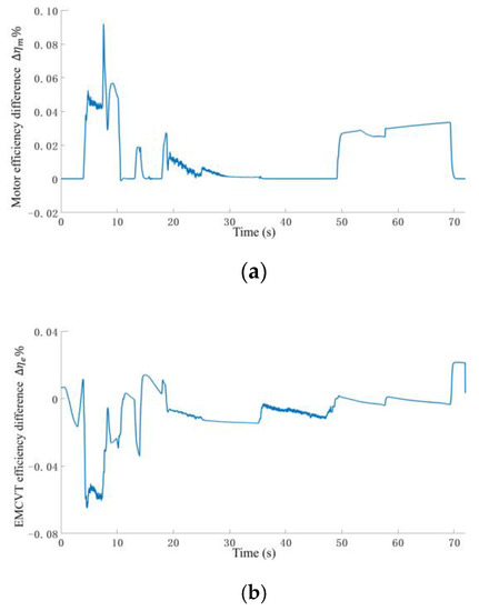 The efficiency difference diagrams: (a) The motor efficiency difference; (b) EMCVT efficiency difference; (c) Vehicle powertrain system efficiency difference.