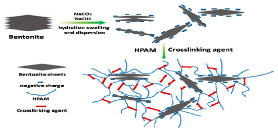 Sodium bentonite hydration: 0.25% sodium hydroxide and 0.5% sodium carbonate were dissolved in water. Then 15% sodium bentonite was added, and the mixture was stirred well. After standing for 48 h, hydrated bentonite was obtained. Under high-speed agitation, hydrated bentonite, polymer (polyacrylamide), and organic crosslinking agent (urotropine, resorcinol, and oxalic acid) and stabilizer (thiourea) were added in sequence and stirred well. The mixed solution was sealed and placed at 80 °C for 48 h to obtain a polyacrylamide/bentonite organic crosslinked composite gel (hereinafter referred to as the composite gel). The preparation process is shown in Figure 1. The formulations of the composite gels are shown in Table 1.