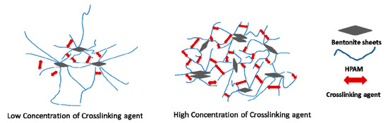 The viscosity change of the composite gel under different crosslinker concentrations is shown in Figure 8. It can be seen from the figure that the composite gel formed by different concentrations of the crosslinking agent still exhibited shear thinning characteristics after shearing. The viscosity of the composite gel formed by the high-concentration crosslinking agent is relatively lower than that of the low-concentration crosslinking agent. This is because the structure of the composite gel formed by polyacrylamide adsorbed on the betonies at a low concentration of the crosslinking agent. The polyacrylamide was partially adsorbed on bentonie, and the rest can be extended in water. Therefore, the viscosity of the gel was formed by the structure of betonies and the structure of entangled polyacrylamide in aqueous solution. Under these conditions, the composite gel had a higher viscosity at a low shear rate, and the shear thinning performance was more obvious at a high shear rate. When the crosslinking agent concentration was increased, the polyacrylamide crosslinked and formed aggregate with betonies. The structures of the composite gel were gradually transformed into bentonie as the structure mainly formed, and the structure formed by the intercalation of polyacrylamide in aqueous solution was decreased. Owing to the reduced structure of polyacrylamide stretching in aqueous solution and the volume of aggregate with bentonite becoming large after crosslinking, the viscosity of the composite gel decreased at a low shear rate and increased at a high shear rate.