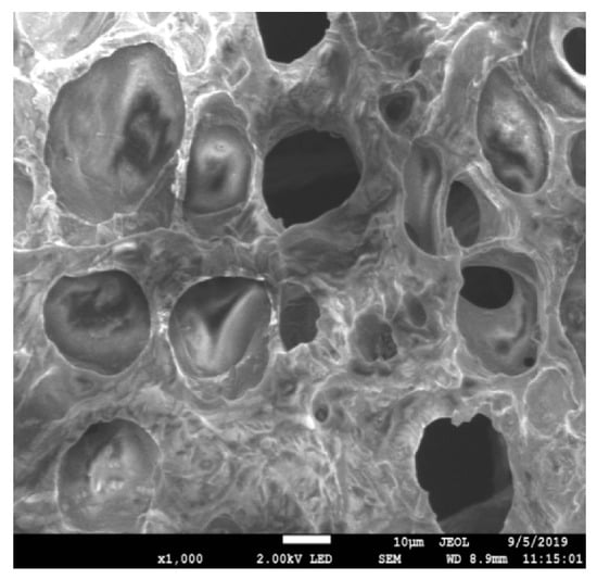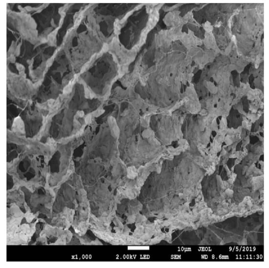 The microstructure of the composite gel (BHCT-2) and the polyacrylamide gel (HCT) is shown in Figure 4 and Figure 5. Comparing the microstructures of the two samples, it can be seen that the polyacrylamide gel (HCT) exhibited a porous medium form, and the inside structure was mainly composed of polymer aggregate formed by intermolecular crosslinking. Different from the polyacrylamide gel (HCT), the structure of the composite gel (BHCT-2) exhibited a sheet-like microstructure and was characterized by the structure of bentonite. This shows that the composite gel was an aggregate structure with bentonite as the core, and the crosslinked polymer was adsorbed on the surface of the bentonite.