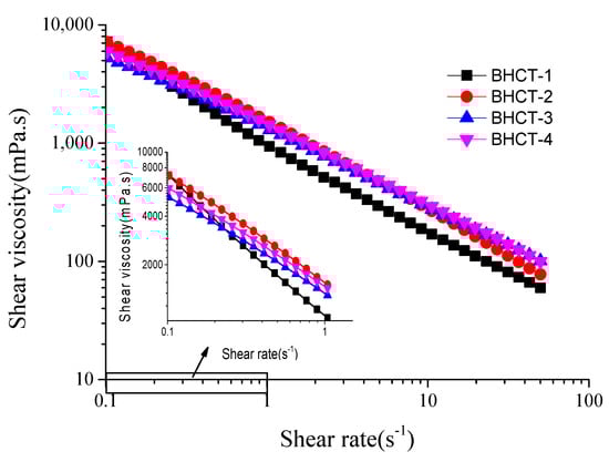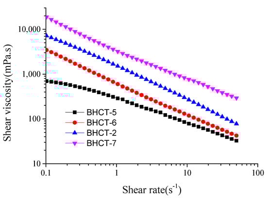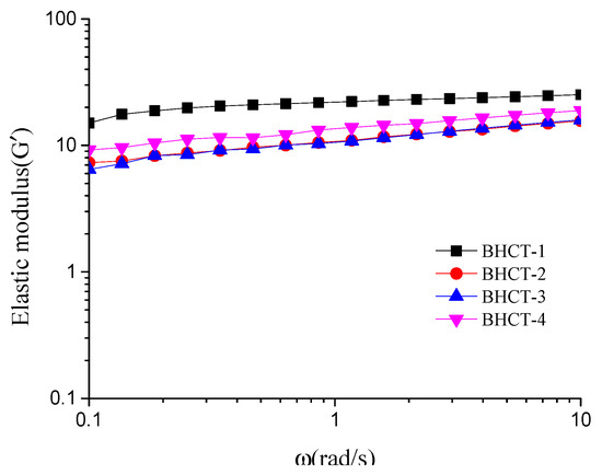 The advanced rheometer (Anton Paar MCR102) employed in this study uses a cylinder measuring device (rotor type CC27) to measure the composite gel under different bentonite contents (BHCT-5, BHCT-6, BHCT-2, and BHCT-7) and different crosslinking agent contents of the composite gel (BHCT-1, BHCT-2, BHCT-3, and BHCT-4).