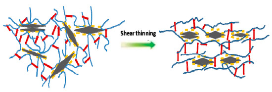 The viscosity change of the composite gel under different bentonite concentrations is shown in Figure 6. It can be seen from the figure that the composite gel exhibited shear thinning characteristics, and the viscosity of the composite gel decreased with increasing shear rate. The bentonite of the composite gel showed different degrees of orientation in the flow direction, and polyacrylamide also exhibited different degrees of stretching, as shown in Figure 7. Bentonite is a flaky particle with a negative charge on the plane and a positive charge on the end face. In the bentonite–water suspension, betonies have face-to-face (FF), edge-to-edge (EE), and face-to-edge (FE) connection methods. The FF mode can lead to thickening and increase of clay particles, while EE and FE connections can easily form a three-dimensional network structure of a “house of cards” between bentonite particles [11,12]. The structural viscosity of the aggregate formed in the solution was low when the amount of bentonite was relatively small, and the aggregate formed with the crosslinked polyacrylamide was less. When the content of bentonite increased, more aggregates were formed, and the distance between the aggregates became smaller, and the interaction increased, forming a strong spatial network structure, especially at low shear rates. The “house of cards” was formed by the mutual attraction of the aggregates and had a strong three-dimensional network structure and a high viscosity of the composite gel. From the viscosity data under high-shear-rate conditions, it can be seen that the viscosity of composite gel increased with increasing bentonite content. The kinetic volume of water was relatively large, indicating that the bentonite in the gel had a stable structure and good shear resistance under high-shear-rate conditions.