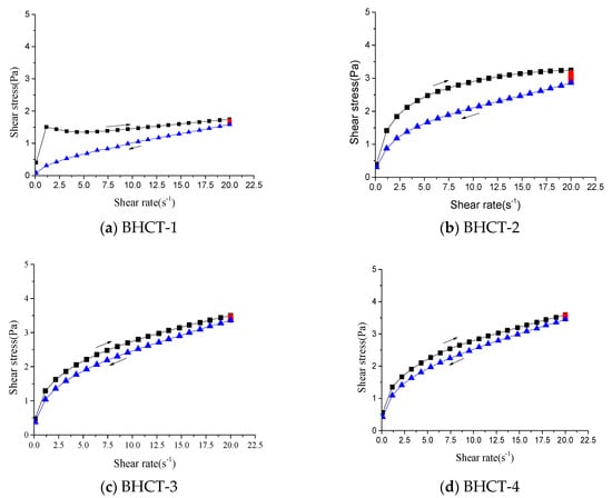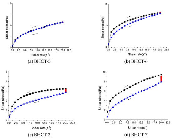 Thixotropy is an important characteristic in rheology. It refers to a rheological phenomenon in which the viscosity or shearing force of a system changes with time under agitation or other mechanical action. The characteristics have important guiding significance for the structural strength and structural change of a material. The area of the thixotropic ring can qualitatively indicate the relative size of the thixotropy of the sample, and a larger area of the thixotropic ring indicates that the system has strong thixotropy. When shearing is applied, if the rate of destruction of the internal structure is greater than the rate of reconstruction, the system will exhibit positive thixotropic properties, and vice versa, i.e., negative thixotropy [16].