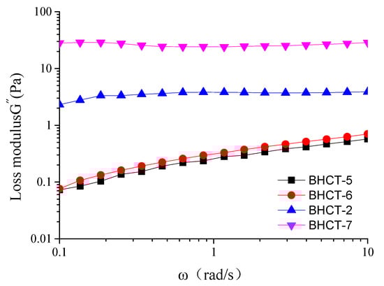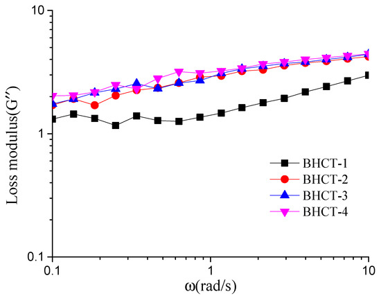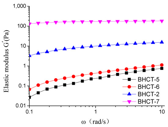 Next, the amount of bentonite and polymer was kept unchanged, and the content of the crosslinking agent was changed. The elastic modulus and loss modulus of the composite gel as a function of the shear angle frequency are shown in Figure 14 and Figure 15, respectively. The elastic modulus of the composite gel decreased with increasing crosslinker agent content, and the loss modulus increased compared with the addition of bentonite. The viscosity of the gel was formed by the structure of bentonite and the structure of entangled polyacrylamide in aqueous solution, and the crosslinking of polyacrylamide and the formation of aggregates with bentonite increased (Figure 2 experimental results) with increasing degrees of crosslinking. The aggregate of bentonite became the main structure for composite gels, and the ability of polyacrylamide to entangle each other in aqueous solution was weakened, resulting in weaker elastic deformation between gels; hence, solid-state properties of composite gels were weakened, and the elastic modulus decreased. The loss modulus increased because the hydrodynamic volume of the aggregate formed by crosslinking increased. When the crosslinking agent content was further increased, the aggregate formed by crosslinking further increased, and there was a certain hydrogen bond attraction between the aggregates. The solid-state characteristics were enhanced, and the elastic modulus increased slightly.