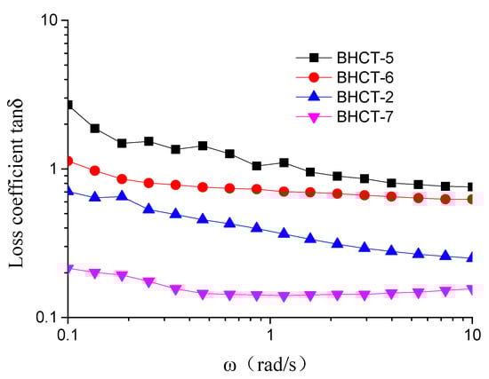The trend of tanδ is shown in Figure 16. As the amount of crosslinking agent increased, the tanδ value increased, indicating that the proportion of the viscous characteristics of the composite gel became larger, and the elastic characteristics were lowered. The result shows that the structure formed by aggregates increased, the hydrodynamic volume increased, and the network of sample formation was incomplete.