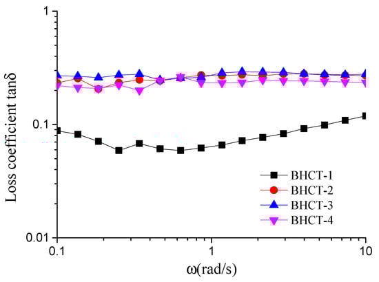 The trend of tanδ is shown in Figure 13. As the amount of bentonite increased, the tanδ value decreased. Because tanδ is the ratio of the loss modulus to the elastic modulus, the smaller the tanδ, the larger elasticity of the sample, indicating that the network structure is more complete. The larger the tanδ, the less the network formed by the sample is in a viscous flow state, and the viscosity ratio becomes larger [16]. As the amount of bentonite increased, the tanδ value of the composite gel decreased. From the rheological point of view, the composite gel of crosslinked bentonite and polyacrylamide formed a strong physical network, the elastic property was increased with the addition of more bentonite, and the network structure was more complete.