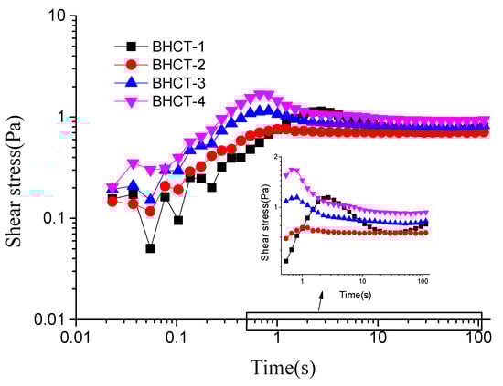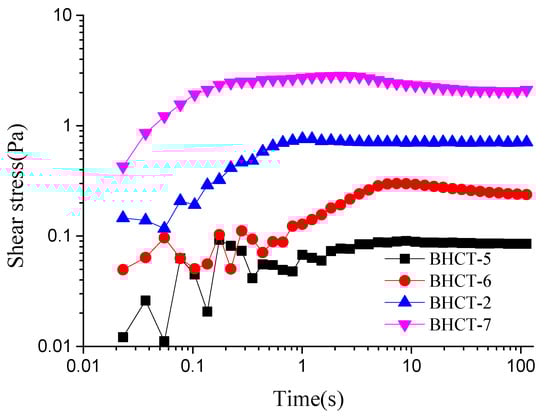 The start-up stress test is a time-dependent apparent shear stress of the gel used to directly characterize the shear stress required for internal structural damage [16]. Figure 17 shows the time-dependent apparent shear stress of the composite gel with different bentonite contents, and Table 5 shows the maximum value of the apparent shear stress. The results show that when the shear rate began to be loaded onto the composite gel, the apparent shear stress increased significantly with time and reached the highest value. The maximum apparent shear stresses at 1 s were 0.760 Pa (for BHCT-2, with a bentonite content of 40,000 mg/L) and 2.837 Pa (for BHCT-7, with a bentonite content of 60,000 mg/L). When the bentonite content was low, the time required for the apparent shear stress to reach the maximum was longer, and the maximum apparent shear stress value decreased. For a decreasing distance between the composite gel aggregates formed by the increase of bentonite, the aggregates were more likely to contact each other to form a stronger internal structure after the shear rate was loaded; hence, the shear stress increased. After the shear stress reached a certain value, the internal structure of the composite gel began to break, and the shear stress decreased. The aggregate had different degrees of orientation in the flow direction. At this time, the composite gel gradually showed shear flow, and the shear stress also tended to be stable.