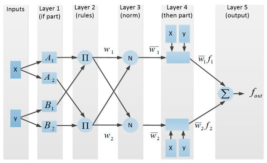ANFIS comprises five different consecutive layers: the first layer is the if-part (fuzzification); the second layer is the rules (production) part; the third layer is norm part; the fourth layer is the then-part (defuzzification); and the fifth layer is the output part []. The main ANFIS structure with two inputs (i.e., x and y) as independent variables and one output (i.e., fout) as the dependent variable is illustrated by Figure 1.