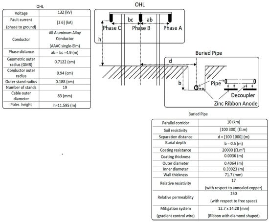 The system modeled in this research is provided in Figure 2. It is comprised of 132 kV OHL and a neighboring, well coated 16″ pipeline. The total length of the metallic pipeline is 10 km, whereas the high voltage OHL length is 20 km. The length of the parallelism of OHL with the pipeline is 10 km; the metallic pipeline is located at the central site with a burial depth of half meter, connected to the gradient control wires as mitigation system. The gradient control wire, as an effective type of mitigation system, is a horizontally-buried zinc anode wire placed at the bottom of the trench beside the metallic pipeline [], and regularly connected to the metallic pipeline, as illustrated in Figure 2. The gradient control wires typically connect to the pipeline at intervals varying from 150 to 600 m. The DC decoupling devices are connected between the pipeline and gradient control wire, which will decouple the DC while remaining the AC coupled. The function of this device is providing a path for the AC current to flow from the pipeline to the zinc ribbon grounding system, while blocking the DC cathodic protection current from flowing to the zinc ribbon conductor.