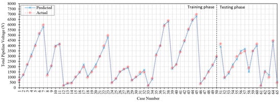Performance of the proposed method (ANFIS-BSA), during testing and training phases, for prediction of the total induced voltage on mitigated pipeline.