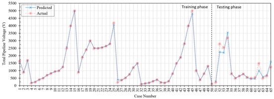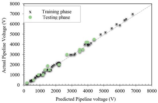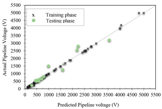 The comparison between the accuracy of methods applied for the prediction the induced voltage on an unmitigated pipeline reveals that optimized ANFIS approaches outperform other studied methods. Furthermore, it was found that the most efficient optimization algorithm applied for training ANFIS was BSA, as the superior MAPE (1.1581%), U-statistic (0.0072), RMSE (0.0197), and absolute error (1.0213) values reported in Table 2 belong to ANFIS-BSA. The performance of proposed method (ANFIS-BSA) in testing and training phases is depicted in Figure 4 and Figure 5.