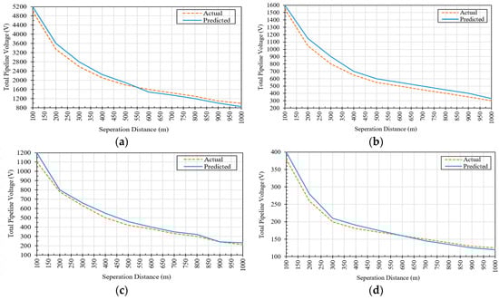 Furthermore, from the connections of the generated ANN models it can be found that separation distances, mitigation effect, soil resistivity, and the phase current’s magnitude have the highest contributions to the induced pipeline voltage levels, respectively. As the separation distance between OHL and pipeline RoW is the most influential parameter on the magnitude of induced voltage, it should be determined prudently to keep the pipelines at safe distances from OHLs. It also indicates that a mitigation system presents significant influence on the level of pipeline voltage. Thus, the developed ANSIS-BSA method was applied to predict the mitigated and unmitigated pipeline voltages at different fault currents and soil resistivities for a wide range of separation distances. Additionally, to validate the reliably of the proposed method, its estimates are compared with those observed from CDEGS program. The comparison between the observed and predicted total pipeline voltages at different soil resistivities and fault currents for a range of separation distances, with and without a mitigation system, are illustrated in Figure 8. According to the simulation results it was found that there is an adequate agreement between the ANFIS-BSA predictions and the observed data. The simulation results clearly indicate that by increasing the separation distances the strength of the electromagnetic field will be reduced; consequently, the pipeline’s voltage level will be decreased. It also can be seen that in the small separation between the OHL and the pipeline, the effect of fault current on the total pipeline potential is more severe than the effect of soil resistivity. Moreover, the obtained results confirmed that mitigation systems can be used in order to significantly reduce the induced pipeline voltage to acceptable level for various fault conditions.