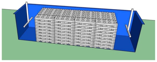 The PCM tank was made of polymeric material, and its dimensions were 3 × 0.75 × 0.75 meters. Inside it, 192 PCM containers were arranged in 16 layers of 12 containers each (Figure 2). The PCM containers were placed in the center of the tank, leaving 0.5 meters free on each side for a proper water flow homogenization. Furthermore, water was driven to and from the tank using PVC T-shaped pipes with multiple holes for proper water distribution.