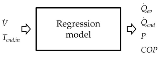 A model of the VCS has been designed to calculate its main energy parameters from the condensing conditions. Therefore, the evaporator conditions have been set constant to obtain chilled water operating temperature of 7/12 °C. The configuration of the compressor and the expansion valve have been set constant too. Thereby, the only parameters defining the performance of the VCS are the condenser conditions, namely the condenser water inlet temperature (Tcnd,in) and its volumetric flow rate () (Figure 3). A regression model has been obtained through a set of measurements on the experimental facility. The adjusted R2 coefficients are shown in Table 2.