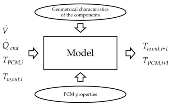 The model of the PCM tank has been designed to provide the water outlet temperature (Tw,out) given the water volumetric flow rate (), the heat transfer rate in the condenser (), the state of the PCM in a specific instant (i) and the water outlet temperature obtained in the previous instant. The state of the PCM in a specific instant is expressed through its temperature (TPCM,i). Finally, the model should provide the state of the PCM for the next iteration (i+1) (Figure 4).