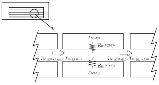 Each PCM section can be considered as a heat exchanger with a thermal resistance between the water and the PCM (Figure 6). The inlet temperature of each section is the outlet temperature of the previous one. The thermal resistance between the water and the PCM (Rw-PCM) consists of a convection resistance between the water and the container and a conduction resistance in the container itself as expressed in Equation (2). Furthermore, when the PCM begins to melt, the liquid phase creates an additional natural convection resistance between the container and the solid PCM as formulated in Equation (3).