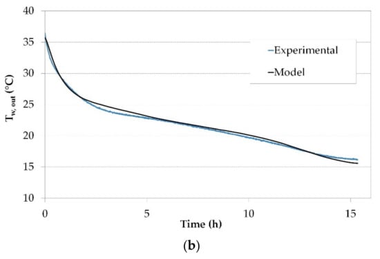Figure 7 shows the performance of the tank water outlet temperature during a typical discharge (a) and charge (b) test. As can be observed, the model brings a good representation of the PCM tank thermal performance, especially during the phase change of the PCM. In the discharge mode, the maximum deviation obtained between the numerical and experimental values of the PCM TES tank water outlet temperature was of 1.2 °C. In the charge mode, a maximum deviation of 1.1 °C was obtained between numerical and experimental values of Tw,out. The maximum deviation was observed usually at the beginning and the end of the simulation, being the difference during the phase change smaller.