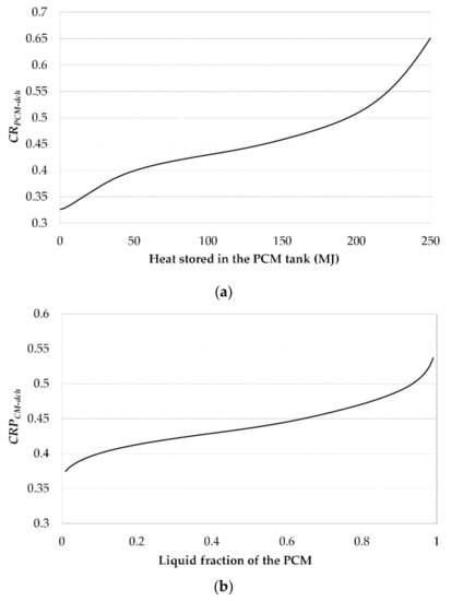 Value of CR in the PCM discharge mode against (a) heat stored in the tank and (b) liquid fraction of the PCM.