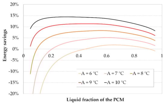Simulation results show the expected increase in energy savings when A is increased (Figure 13). For a value of A equal to 6 °C and below the energy savings were negligible for the PCM, and the chiller analyzed in this work. A configuration with a lower thermal resistance between the PCM and the water would provide lower water temperatures at the outlet of the PCM tank and, thus, higher energy savings lowering the threshold value of A obtained in this simulation.