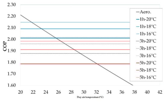 Figure 14 shows the results of the simulation, where the intersection between the aerothermal COP and each of the nine PCM scenarios determined the switch day ambient temperature above which the PCM mode grants energy savings over the aerothermal mode. As can be observed, the scenario with the highest COP (use period of 1 hour and night temperature of 16 °C) provided energy savings for day temperatures above 22 °C while the scenario with the lowest COP (use period of 5 hours and night temperature of 20 °C) provided energy savings only for day temperatures above 32 °C.