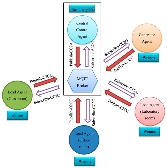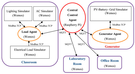 As shown in Figure 1, agents are implemented on the embedded systems in which the load agents and the generator agent are implemented on Wemos modules, while the central control agent is implemented on a Raspberry Pi module. A lighting simulator, AC simulator, and electrical load simulator are used to simulate the lighting, the AC, and the electrical load in the classroom, respectively. To provide a flexible implementation, a popular Modbus TCP/IP protocol is employed to communicate between the load agent and the devices. Fortunately, the Wemos is equipped with a built-in WiFi module, thus the Modbus TCP/IP protocol could be implemented easily via WiFi communication. A PV-battery simulator is developed to simulate the PV-battery system. Similar to the classroom, the simulator is implemented on Wemos modules and communicates with the generator agent using the Modbus TCP/IP protocol. The simulators in the laboratory room and the office room are developed in a rather different way. Instead of implementing the simulators on the separate modules, they are implemented in the same Wemos module with the load agent.