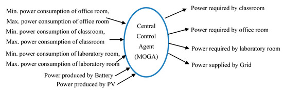 To solve the above multi-objectives optimization problem, we adopt the Multi-Objective Genetic Algorithm (MOGA), more specifically the NSGA-II as proposed by [50]. The MOGA is implemented on the central control agent to find the optimal power required by the building based on the current power consumptions and the generated power as illustrated in Figure 2. As shown in the figure, the inputs of the central control agent are the minimum and maximum power consumptions of the classroom, the office room, and the laboratory room, the power produced by the battery and the PV. Then these values are used by the MOGA to solve the multi-objective optimization as expressed in Equations (1)–(8). The outputs of the central control agent are the optimal values of power required by the classroom, the office room, and the laboratory room which are sent to the respective agents.