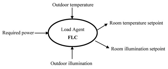 Figure 3 illustrates the input and output data of the load agent. As shown in the figure, the inputs are the required power, the outdoor temperature, and the outdoor illumination. These data are used by the fuzzy logic controllers (FLCs) to determine the optimal room temperature and illumination setpoints. There are two FLCs, one for controlling the room temperature setpoint (called as FLC-T), and another one for controlling the room illumination setpoint (called as FLC-I). The inputs of FLC-T are the required power and the outdoor temperature, while the output is the room temperature setpoint. The membership functions of the required power, the outdoor temperature, and the room temperature setpoint are shown in Figure 4, where each variable has three linguistic values, i.e., Low (LOW), Medium (MED), and High (HIGH). The values of the required power (658 W–1137 W), the outdoor temperature (26 °C–30 °C), and the room temperature setpoint (20 °C–25 °C) are normalized to 0–1.