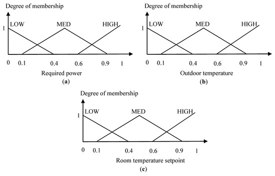 Membership functions of FLC-T: (a) Required power; (b) Outdoor temperature; (c) Room temperature setpoint.