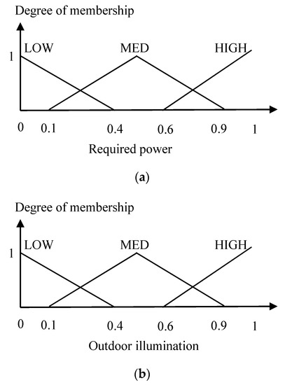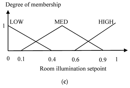 The inputs of FLC-I is the required power and the outdoor illumination, while the output is the room illumination setpoint. The membership functions of the required power, the outdoor illumination, and the room illumination setpoint are shown in Figure 5, where each variable has three linguistic values, i.e., Low (LOW), Medium (MED), and High (HIGH). The values of the required power (658 W–1137 W), the outdoor illumination (1000 lx–10,000 lx), and the room illumination setpoint (300 lx–500 lx) are normalized to 0–1.