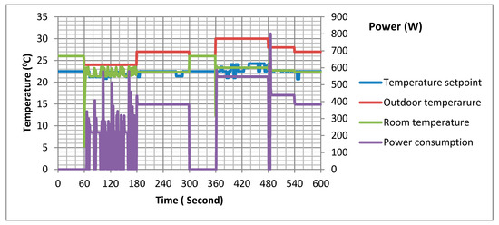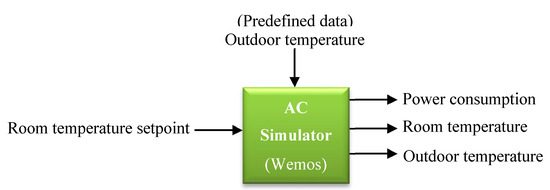 The block diagram of AC simulator is illustrated in Figure 7, where it has two inputs, i.e., the outdoor temperature which is predefined data stored in the Wemos module, and the room temperature setpoint which is received from the load agent (see Figure 1). The AC simulator sends the power consumption, the room temperature and the outdoor temperature to the load agent.