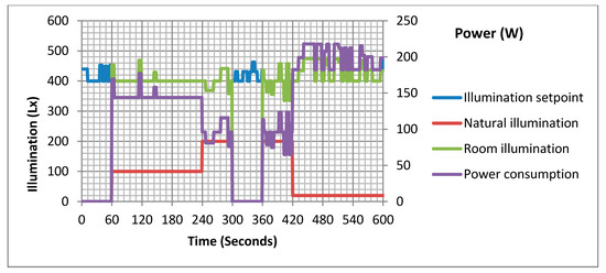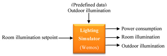 The block diagram of lighting simulator is illustrated in Figure 8. It has two inputs: the outdoor illumination which is a predefined data stored in the Wemos module, and the room illumination setpoint which is received from the load agent. The lighting simulator sends the data of the power consumption, the room illumination and the outdoor illumination to the load agent.