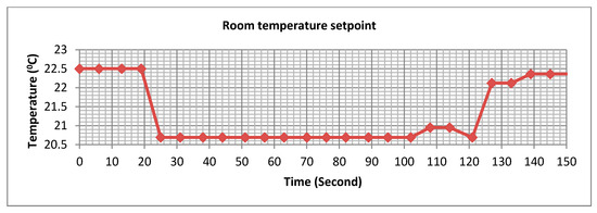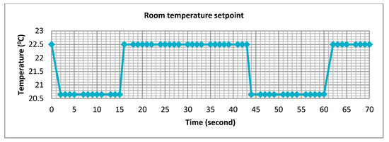 The model of an air conditioning (AC) system is a modified version of the model in [51]. Since the model in [51] is the heater system, we modify it to become the cooling system to fulfill with our proposed system. The important contribution of our work is that the model is simulated in the embedded system (Wemos module) for real-time implementation, especially for the electronic/communication aspects. The AC simulator consists of two models: the AC (cooling system) and the thermodynamic model of a room. The AC system is expressed by Equation (12), while the thermodynamic model of a room is expressed by Equation (13). The electrical power consumed by the room is simplified by a linear function of the difference between the outdoor temperature and the room temperature as expressed by Equation (14):