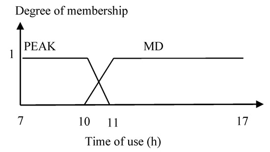 In the experiments, we compare our proposed method that adjusts the temperature and the illumination setpoints to the existing method proposed by [2] (called as EXT), the fixed setpoint methods, i.e., the setpoint is set to the minimum comfort (called as Min-comfort), the setpoint is set to the middle comfort (called as Mid-comfort), and the setpoint is set to the maximum comfort (called as Max-comfort). The EXT [2] employs the FLC to adjust the temperature. The difference with our approach is described briefly in the following. Instead of using the required power and the outdoor temperature as the fuzzy inputs, the EXT uses the electricity price and the outdoor temperature. In this case, the electricity price has two linguistic values (PEAK, MD), whose membership functions are shown in Figure 18. As shown in the figure, the electricity price is expressed in respect to the time of use, which is adopted from [2]. While the membership function of the outdoor temperature and the temperature setpoint are the same with our proposed method. The fuzzy rules are given in Table 12.