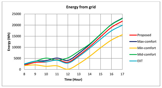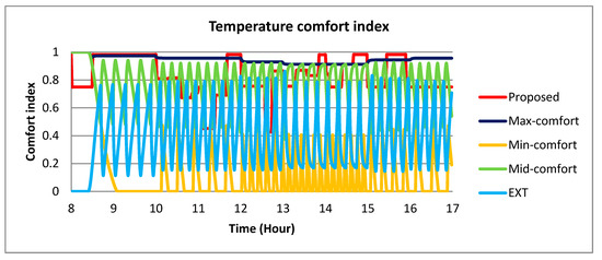 Figure 19, Figure 20 and Figure 21 illustrate the comparison of temperature comfort index, the illumination comfort index in the office room, and the energy extracted from the grid of five methods. Figure 19 shows that during 8 h to 17 h, the temperature comfort indices of Min-comfort, Mid-comfort, and EXT oscillate. The oscillation is caused by the thermostat control used for controlling the AC. Meanwhile, the temperature comfort index of our proposed method varies to find the optimal value and at the same time reduces the oscillation effect of the thermostat control. The figure also shows that the comfort index of the EXT is in the middle between Mid-comfort and the Min-Comfort.