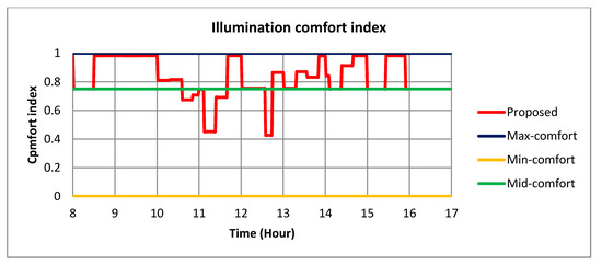 In Figure 20, the profiles of the illumination comfort index do not show the dynamic behavior compared to Figure 19 due to fact the illumination model is simple. Since the EXT does not consider the illumination comfort index, it is not shown in Figure 20. By observing Figure 19 and Figure 20, the profile of temperature comfort index of our proposed method is similar to the illumination comfort index of or proposed method. This result could be understood from the fact that both FLC controller (FLC-T and FLC-I) have similar membership functions and the fuzzy rules.