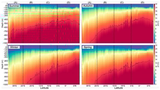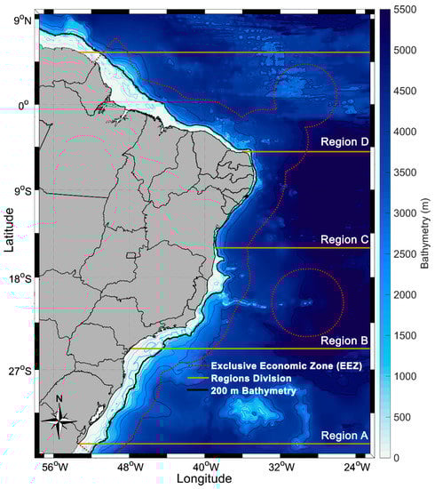As illustrated in Figure 2, the study area included the Brazilian coastline inside the EEZ, which is divided into four regions A, B, C and, D, according to both hydrodynamic and atmospheric characteristics. Table 1 shows the regions and the corresponding latitudes.
