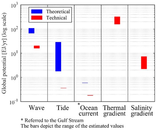Figure 3 shows a summary of the potential of ocean renewable energy resources based on the references presented in this paper. The bars illustrate the range of estimated resource potential. Note that the technical potential of ocean current is shown as presented in [60] for the Gulf Stream.