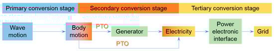 Currently, there are a large number of concepts and patents on the use of wave energy. As illustrated in Figure 4, the process of the wave energy conversion can be divided into three main stages: the primary conversion stage, the secondary conversion stage, and the tertiary conversion stage [72]. In the primary conversion stage, the wave converter captures the kinetic energy of the waves through wave body interactions (e.g., buoy oscillation, air flow, or water flow). The secondary conversion stage converts the body motion energy into electricity through the power take-off (PTO) system, and the tertiary stage adapts the characteristics of the produced power to the grid requirements with power electronic interfaces.