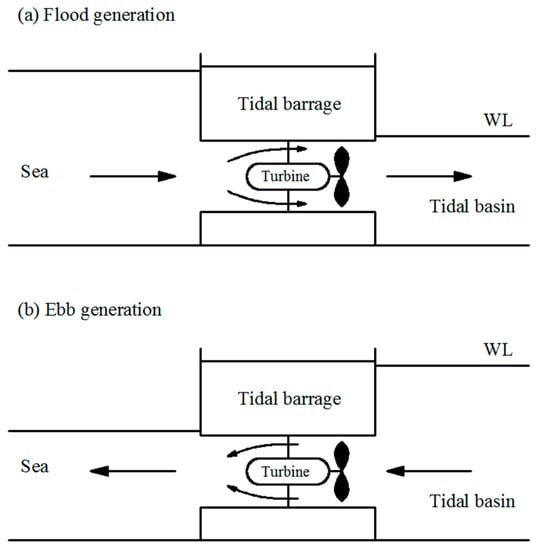 Figure 7 presents the principle of the tidal barrage power plant [109]. The shapes of structures are similar to dams and the structures are built in the estuary or bays to store water at high tide. A difference in water height at the internal and external sides of the dam occurs due to changes in the tidal regime. Three main tidal barrage schemes are