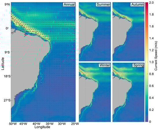 Near-surface (~5 to 50 m) u and v components of velocity from January 1, 2007 to December 31, 2017 were used as a subset of the area corresponding to the Brazilian coastline (25°W–55°W and 6°N–34°S).