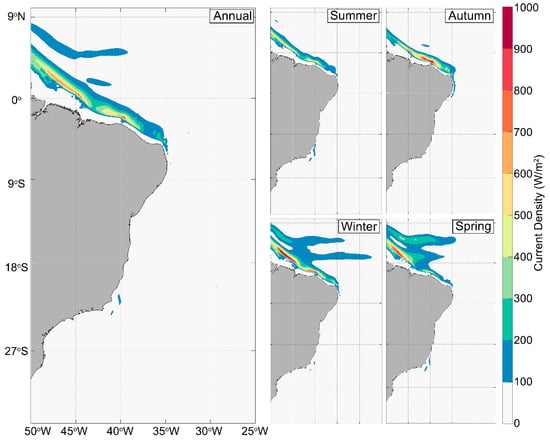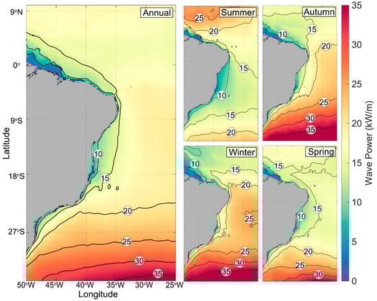 The variability of the available ocean renewable energy in time is an important issue due to its impact on the capacity factor, which, consequently, affects the economy of the ocean energy system. Two different metrics were used to address the seasonal and temporal variability of the Brazilian coastline. The seasonal variability (SV) index [40] can be expressed as follows: