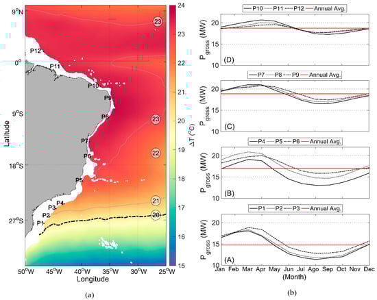 Gridded daily seawater temperature (°C) model output with 50 vertical layers and ~9 km in horizontal resolution was used to analyze the temperature difference (ΔT (°C)) between the surface warm water and the deeper cold water. It was assumed that the superficial water intake pipe was located at about 20 m and the deepest point in the vertical depth stratification was approximately 1000 m. At specific locations (each grid cell), we calculated the gross power () following the methodology described by [33,34]. The OTEC gross power can be expressed as the product of the evaporator heat load and the conversion efficiency of the gross OTEC [34]: