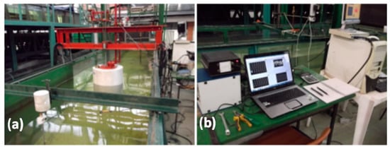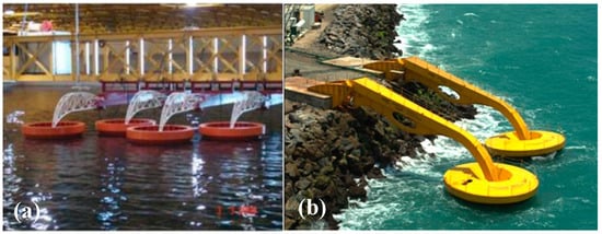 - The oscillating water column (OWC), which compresses or decompresses the air in a chamber using the wave elevation to drive a Wells or impulse turbine to convert wave power. Depending on the location of installation, OWC devices can be fixed onshore [76,77,78], as shown in Figure 6a, or floating, as shown in Figure 6b [79,80,81].