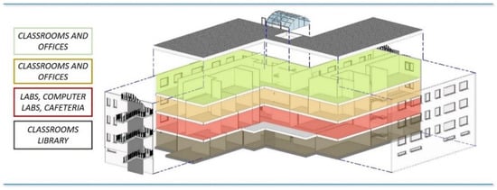 The building has been refurbished in the last fifteen years and, starting from the 2006, it is used by the Italian University of Molise (UNIMOL). It is developed in the north-south direction, and features four floors, one of which is partially buried, as shown in Figure 1. The inter-floor height is 3.2 m and the overall height aboveground is around 13.2 m. The building surface area and the overall volume are 2626 m2 and 9456 m3 respectively. The net conditioned building area is 2113 m2, the net conditioned volume is 7606 m3.