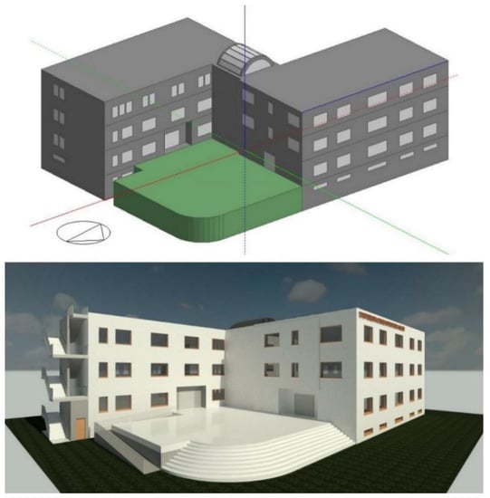 All told, the total end uses for the electric systems, including heating, cooling, interior equipment, interior lighting, fans and water systems is about 127,296 kWhel/year (260,853 kWhPRIMARY/y, 123.5 kWhp/m2y). Obviously, the energy demand of the building depends not only on the electric systems, but also on the thermo-physical features of the thermal envelope. Specifically, two different typologies of opaque envelope characterize the building. In detail, the partially buried floor has a thermo-concrete external wall with a thermal transmittance (U-value) of 0.51 W/m2K, while the walls above the ground have two hollow brick layers with an intermediate air gap, and a calculated U-value of 0.66 W/m2K. Moreover, the basement slab on the aerated crawl space and the building roof have respectively U-values of 0.40 W/m2K and 0.37 W/m2K. The transparent building envelope is characterized by double glazing windows with aluminum frames (equipped with a thermal break technology) and thus an overall UW equal to = 3.67 W/m2K. Some indoor spaces have solar shadings. The energy performance investigations of the present building, and the impact analysis of the applied energy efficiency measures (EEMs, in the following lines) were realized through dynamic simulation studies, by using the well-known software EnergyPlus [], by defining the model geometry through DesignBuilder [] (Figure 2).