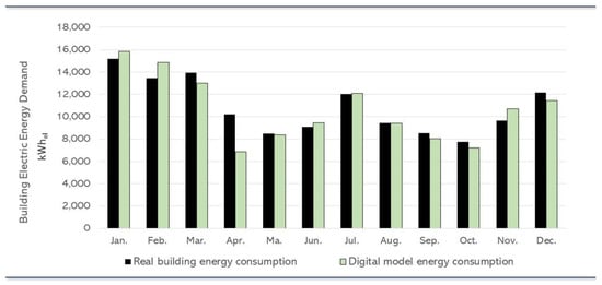 In order to check the reliability of the numerical model, the results of the simulations have been compared with the energy bills relative to the electricity demands of the last three years. The comparison with historical consumption and the knowledge of the use profiles of the plants and the installed systems allowed the calibration of the numerical model using the indicators proposed by the ASHRAE (American Society of Heating, Refrigerating and Air-conditioning Engineers) Guideline 14 [] and the M&V Guidelines []. These indicators, moreover, have highlighted some current management criticalities. A first calibration index, for investigations calibrated on the basis of monthly values, is the Mean Bias Error (MBE). In detail, the correspondence between energy demands required by the real building and the model are compared and thus the MBE indicator identifies the average percentage error by comparing energy consumption in individual months and throughout the year. This calculation, therefore, allows to understand how much the energy requirement of the numerical model differs from the monitored building on a monthly basis. The MBE value is obtained through the following Equation (1), where “M” means the consumption measured annually in kWh, and “S” is the same value but referred to the numerical model: