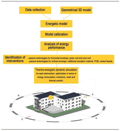 Starting from the aforementioned studies, aimed at describing, even if very synthetically, the technologies here adopted and some authoritative examples of their applications, the present work focuses on the analysis of energy efficiency measures applied to an existing building owned by public Institutions that, according to the recent EU Directives in matter of energy efficiency in buildings, must have demonstrative and exemplary roles. Examples of typologies of study like this are not very widespread, and unlike the studies cited [,], the proposed work compares traditional solutions with innovative, which makes it rare if not unique in its field.
