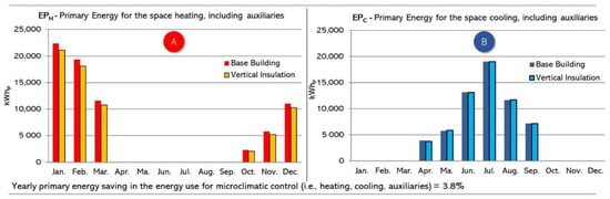 - The thermal insulation layer reduces the energy consumption of 1.1% during a year, but the investment costs are too high. In fact, the vertical insulation with expanded polyurethane, having a thermal conductivity equal to 0.026 W/m2K, implies an investment cost of €128,140, but also a return time of the capital higher than 30 years and thus a negative NPV has been calculated. These results are in line with those obtained by Ascione et al. []. The study focused on the application of different measures for the retrofit of a Conference Hall in Naples. In the specific case of the thermal insulation (8 cm of polyurethane), they obtained an annual variation of primary energy of 0.7% and a SPB major than 30 years.